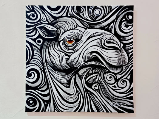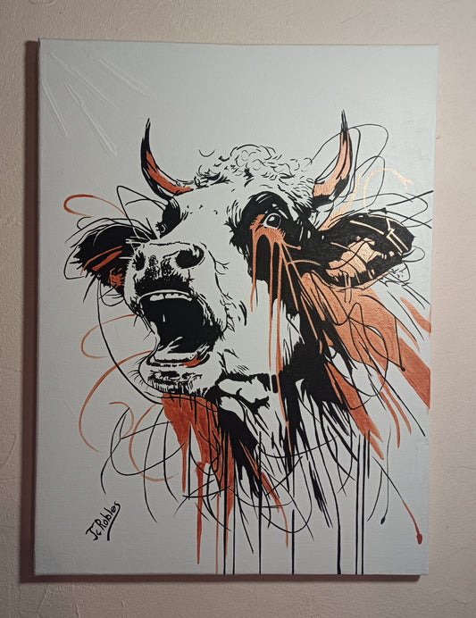 - Une œuvre originale représentant une vache, peinture sur fond travaillé au couteau.